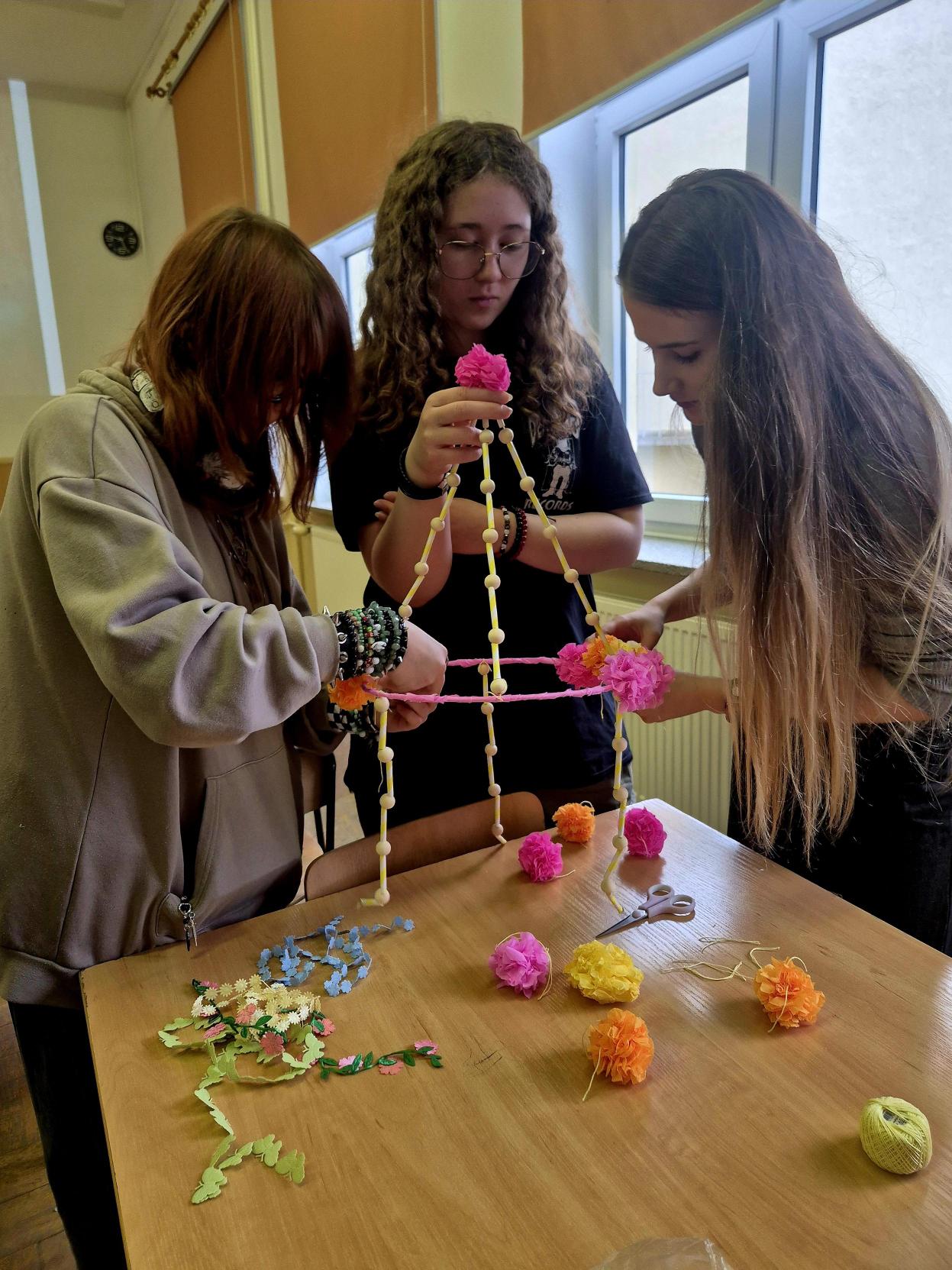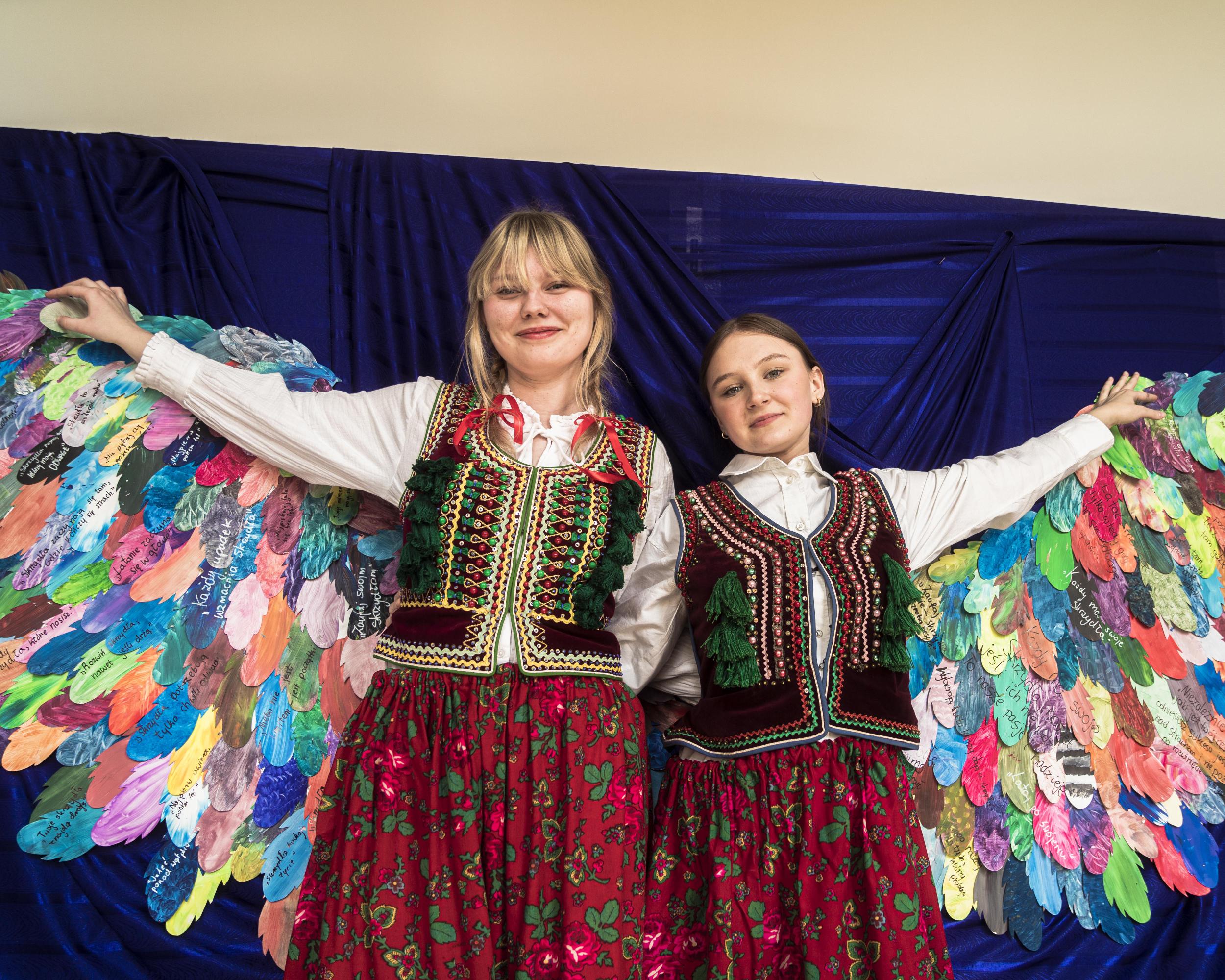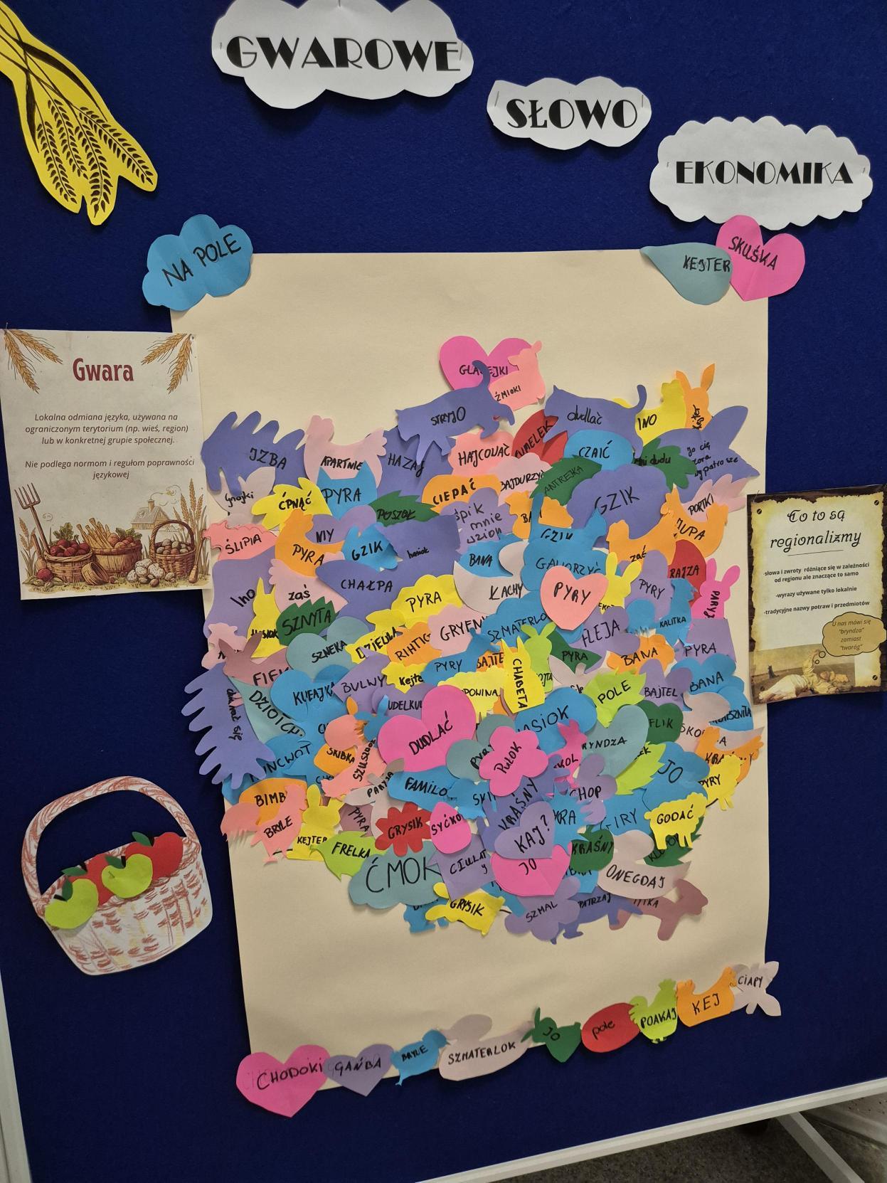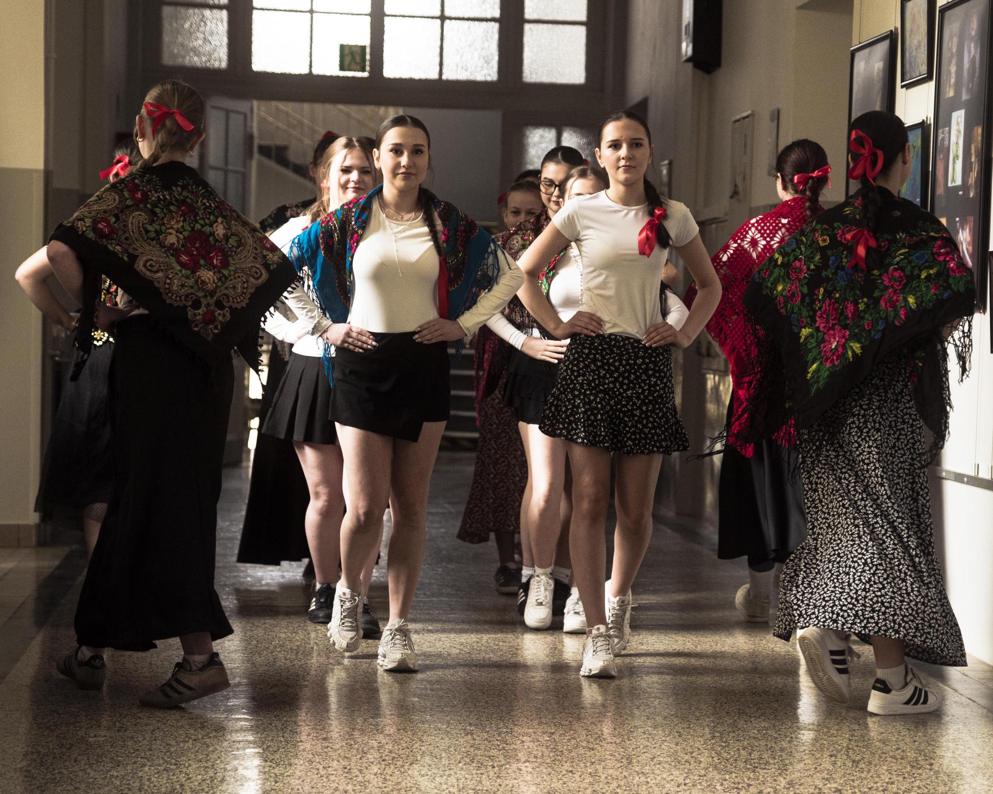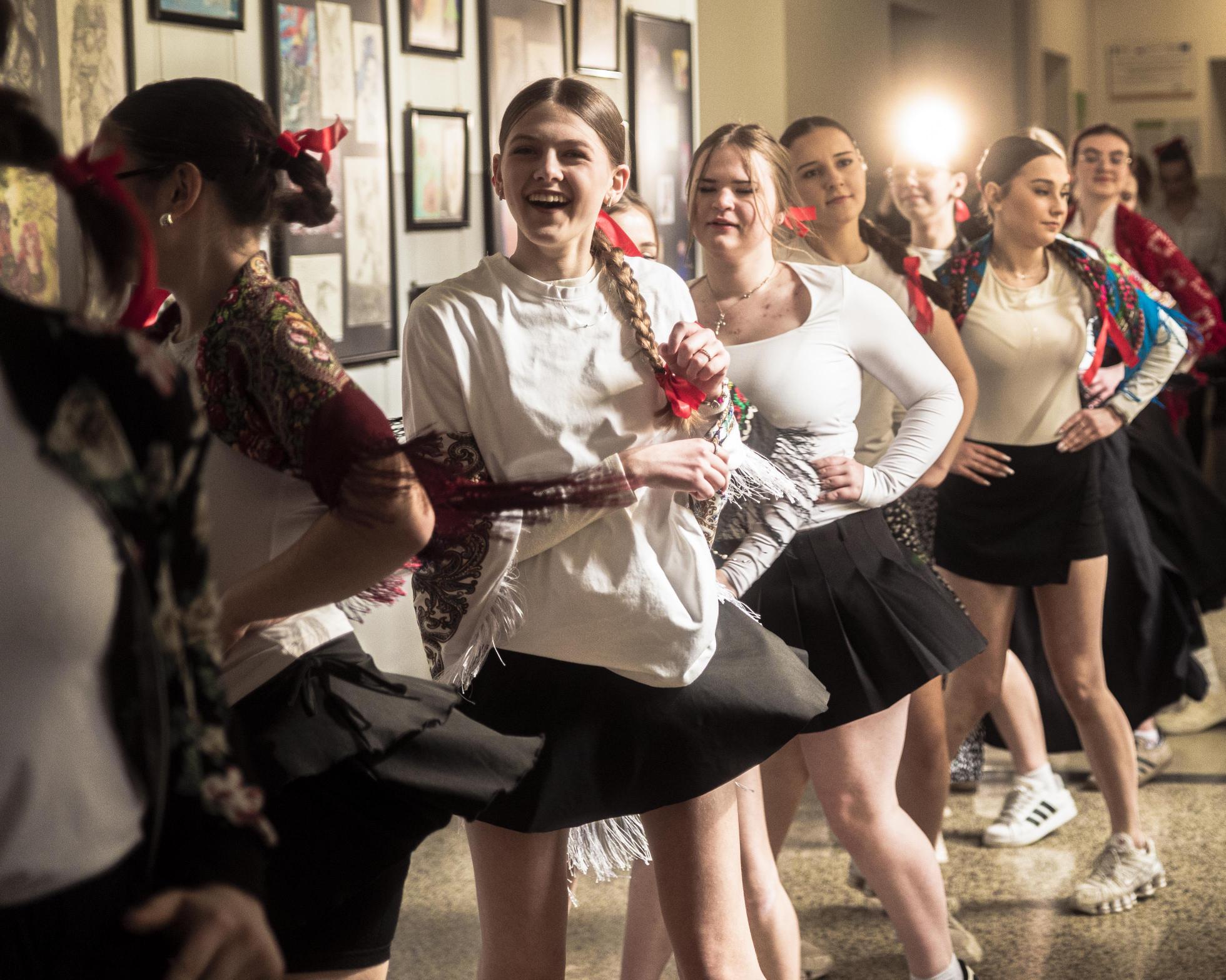 Podczas Warsztatów Pajęczarzy wyczarowaliśmy piękne dekoracje – tradycyjne pająki. Kolorowe dzieła udowodniły, że w każdym z nas drzemie ludowy artysta. Przetrwaliśmy w Chacie Dziada! Nasz szkolny escape room zmusił nas do nie lada wysiłku. Rozwiązywanie zagadek w mrocznym klimacie wiejskiej chaty wymagało od nas sprytu i pomysłowości. Spokojnie, wszyscy wyszliśmy cało! Ludowe rytmy na parkiecie — przebrani w kolorowe, tradycyjne stroje — odczarowaliśmy regionalne tradycje. Było niemal tak hucznie jak na weselu u Boryny. Gwara jest w modzie – rozstrzygnęliśmy plebiscyt na gwarowe słowo roku. Dudlać, hajcować, ślipia…. Wybór nie był łatwy, bo nasza mowa ma w sobie mnóstwo gwarowych perełek. Dostaliśmy skrzydeł – na korytarzu wyrósł wyjątkowy projekt skrzydeł, stworzony z cytatów. To idealne miejsce na ciekawe zdjęcie i chwilę refleksji. W szkolnych murach powstała też niezwykła galeria prac, których nie powstydziłaby się sama Jagna. Na chwilę można więc przenieść się do magicznego świata barw i symboli.