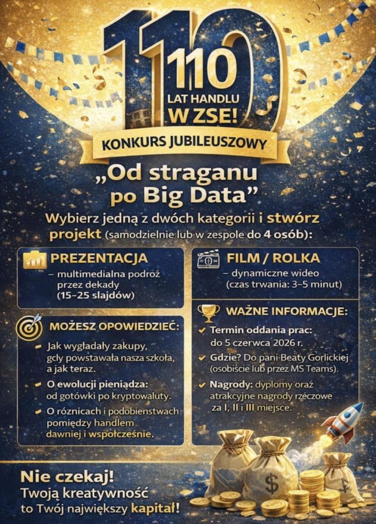 Z okazji 110-lecia Zespołu Szkół Ekonomicznych im. Marii Skłodowskiej-Curie zapraszamy uczniów ZSE do udziału w konkursie: „Od straganu po Big Data. 110 lat transformacji w handlu”.